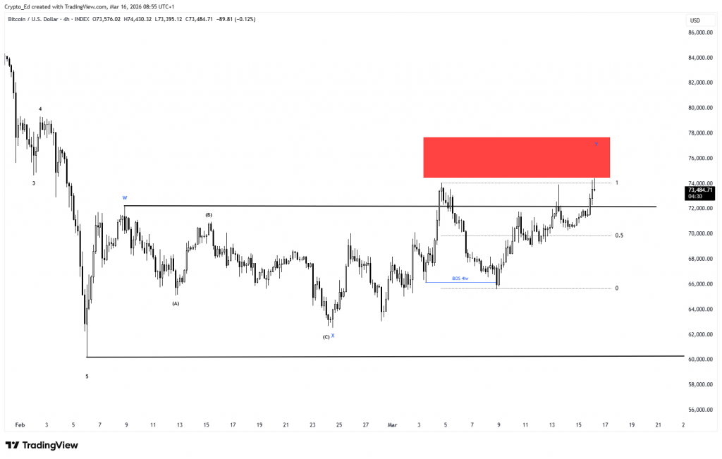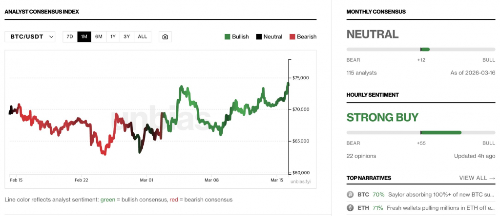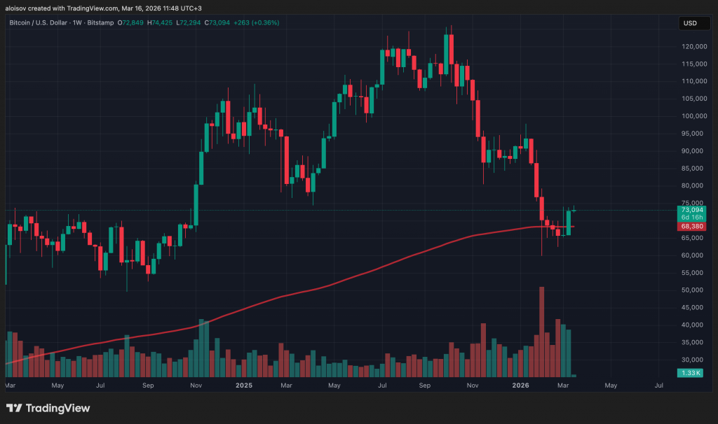 Биткоин пробил отметку $74 000 и вернулся к уровням начала февраля. 16 марта на бирже Bitstamp цена достигла $74 425 — максимума с 4 февраля. Недельный прирост составил 10,3%, а недельная свеча закрылась выше 200-недельной экспоненциальной скользящей средней — уровня, традиционно разделяющего бычий и медвежий рынки.