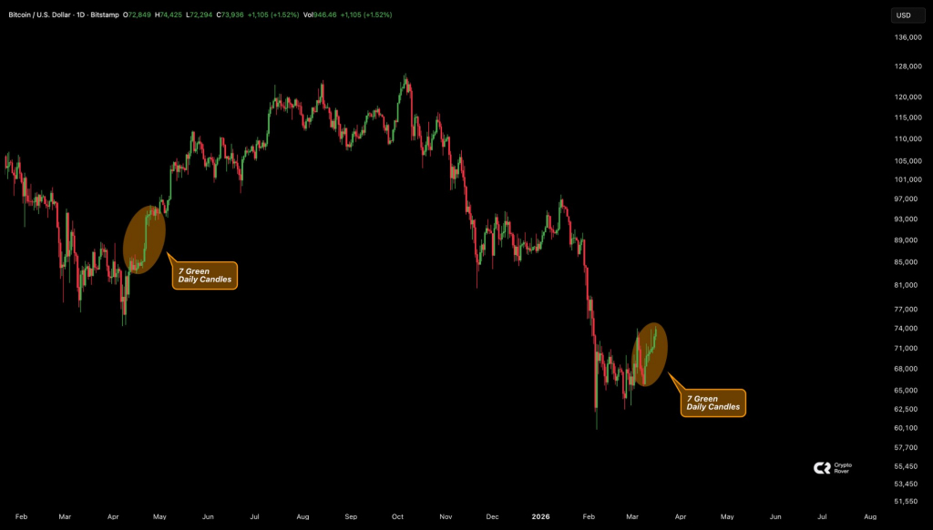 Техническая картина подкрепляет позитивные настроения: семь дневных свечей биткоина закрылись в плюс подряд. Инвестор Crypto Rover напоминает, что аналогичная серия в последний раз наблюдалась после того, как рынок нащупал дно на фоне тарифных потрясений.