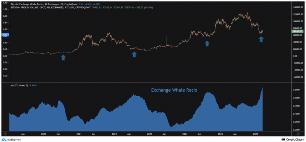 Аналитическая платформа CryptoQuant фиксирует: индикатор Exchange BTC Whale Ratio — доля крупных игроков в общем объеме транзакций на биржах — вышел на максимум за шесть лет. Согласно логике платформы, рост этого соотношения соответствует краткосрочному дну, а достижение пикового значения — точке, с которой начинается восходящий тренд.