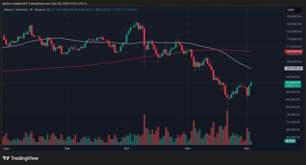 Биткоин поднялся выше $93 000 после обвала 1 декабря, вернув все двухдневные потери. По данным Binance, биткоин достиг максимума в $93 958 в начале торгов 3 декабря.