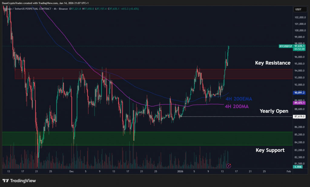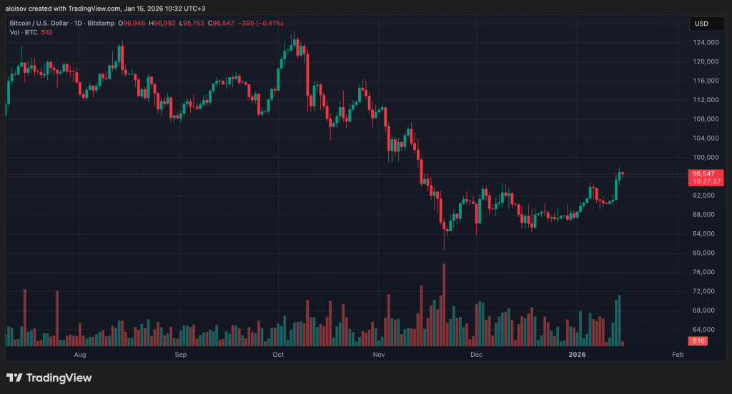 Биткоин завершил двухмесячное боковое движение и вышел вверх из диапазона $94 000-$96 000. 13 января актив достиг $97 939 на бирже Bitstamp, продемонстрировав рост на 6,36% за два дня.