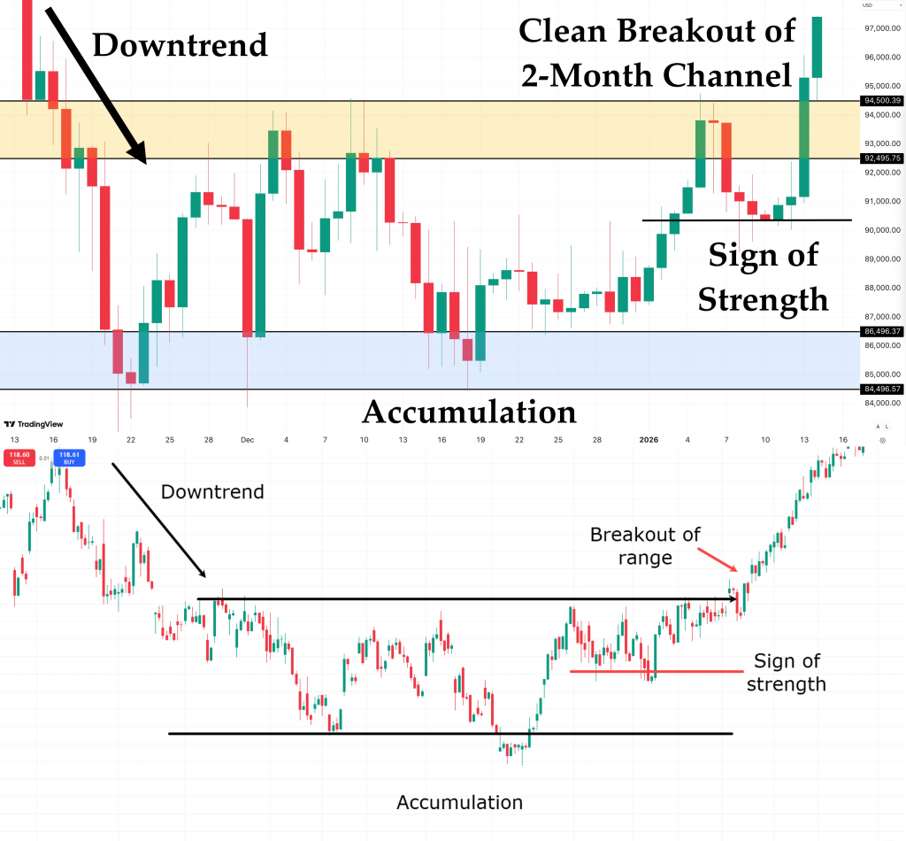 Создатель квантильной модели биткоина Plan C указывает на появление четкого сигнала, который он отслеживал на протяжении нескольких недель. Аналитик представил графики, демонстрирующие завершение фазы накопления и начало выхода из двухмесячного диапазона.
