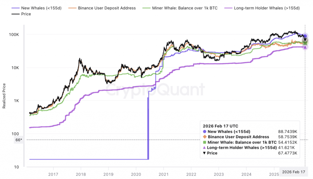 Паника продавцов на биржах несколько спала после того, как биткоин отскочил от 15-месячного минимума ниже $60 000 в начале февраля. Тем не менее ончейн-данные указывают на сохраняющийся риск дальнейшего давления: четыре уровня реализованной цены — $88 700, $58 700, $54 700 и $41 600 — теперь образуют последовательную «дорожную карту» для оценки глубины возможной коррекции.