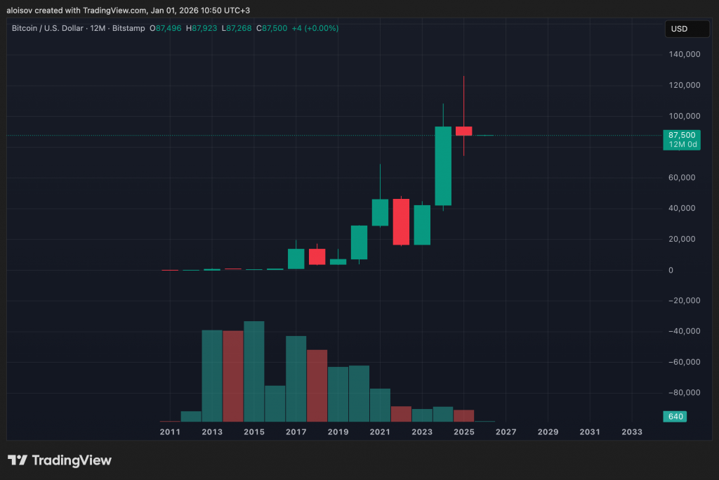 Биткоин впервые за всю историю завершил год после халвинга в убытке, нарушив четырехлетний цикл, который существовал более десятилетия. Первая криптовалюта закончила 2025 год ниже уровня, с которого она его начала — событие, которое ранее никогда не происходило в после халвинга.