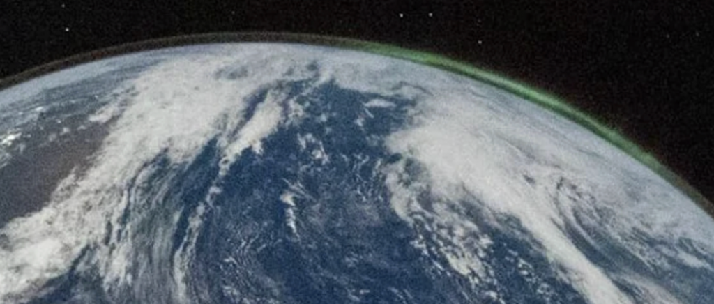 На фотографии заметны слабые зеленоватые свечения у обоих полюсов. У Северного полюса это северное сияние, или aurora borealis, а у Южного — южное сияние, aurora australis. Такие явления возникают в результате взаимодействия частиц солнечного ветра с магнитным полем Земли и верхними слоями атмосферы. Они представляют собой видимое проявление космической погоды — сложного танца частиц и магнетизма между Солнцем и нашей планетой.