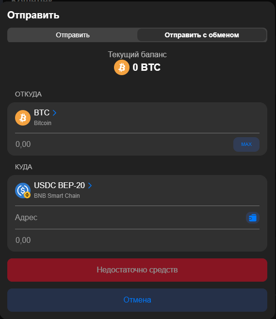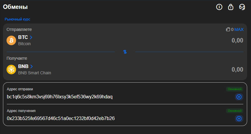 - Вы выбираете, что отправляете (например, USDT TRC-20) и какой токен нужно получить (например, USDT BEP-20, BTC или ETH);