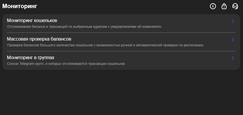 Функционал включает в себя отслеживание баланса кошельков и транзакций с получением уведомлений.