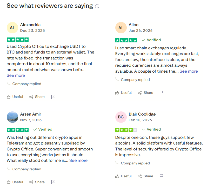 Crypto Office насчитывает более 20 000 активных пользователей. Сервис получает высокие оценки на специализированных площадках. Пользователи отмечают скорость работы приложения и прозрачность комиссий, которые сервис показывает заранее.