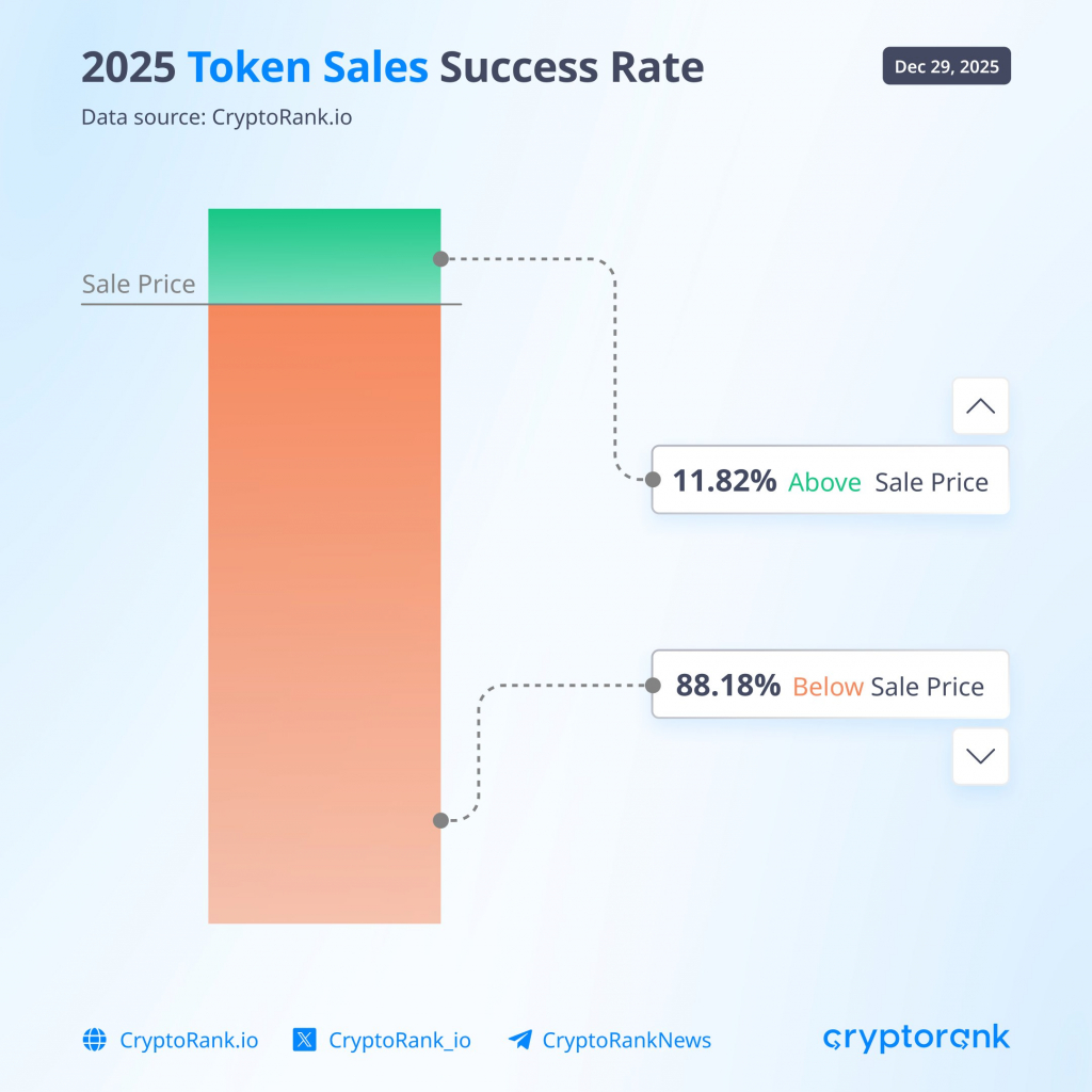 Однако большинство розничных инвесторов терпят серьезные убытки — 88% токенсейлов 2025 года принесли потери инвесторам. Из 533 проведенных ICO лишь 63 проекта торгуются выше стартовой цены, что указывает на фундаментальный сдвиг от спекулятивных розничных стратегий к долгосрочному корпоративному накоплению.
