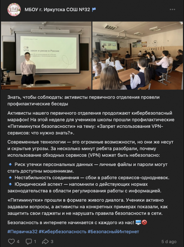 В школе № 32 Иркутска на этой неделе прошли профилактические «Пятиминутки безопасности» с характерным названием: «Запрет использования VPN-сервисов: что нужно знать?». Ученикам рассказывали о рисках, которые якобы несут подобные инструменты. В Ростовской области, в школе № 81 посёлка Юловский Сальского района, провели «беседы по безопасному интернету», где обсуждались персональные данные, цифровой след, анонимность в сети и — отдельным пунктом — риски использования VPN.