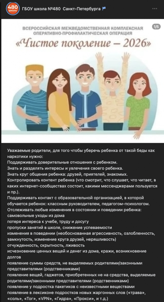 Наиболее показательным выглядит случай петербургской школы. ГБОУ № 480 Кировского района Санкт-Петербурга в рамках всероссийской межведомственной операции «Чистое поколение — 2026» разослала родителям памятку, в которой слова «VPN», «прокси» и «Tor» включены в перечень возможных признаков вовлечения подростка в употребление наркотиков — в один ряд с жаргонными словами «трава» и «соль». Родителям рекомендуется контролировать переписку детей, отслеживать контент, платежи, мессенджеры и устанавливать родительский контроль на устройства.