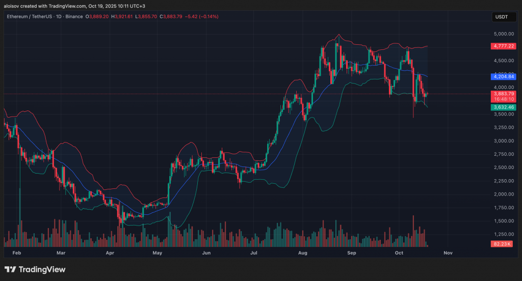 Ethereum дважды за текущий месяц опускался до уровня $3 700 и демонстрирует признаки восстановления. Solana повторила похожее движение с двойным касанием отметки $175 в октябре, после чего начала незначительное восстановление. W-образное основание в полосах Боллинджера представляет бычий сигнал разворота, указывающий на потенциальный рост цены.