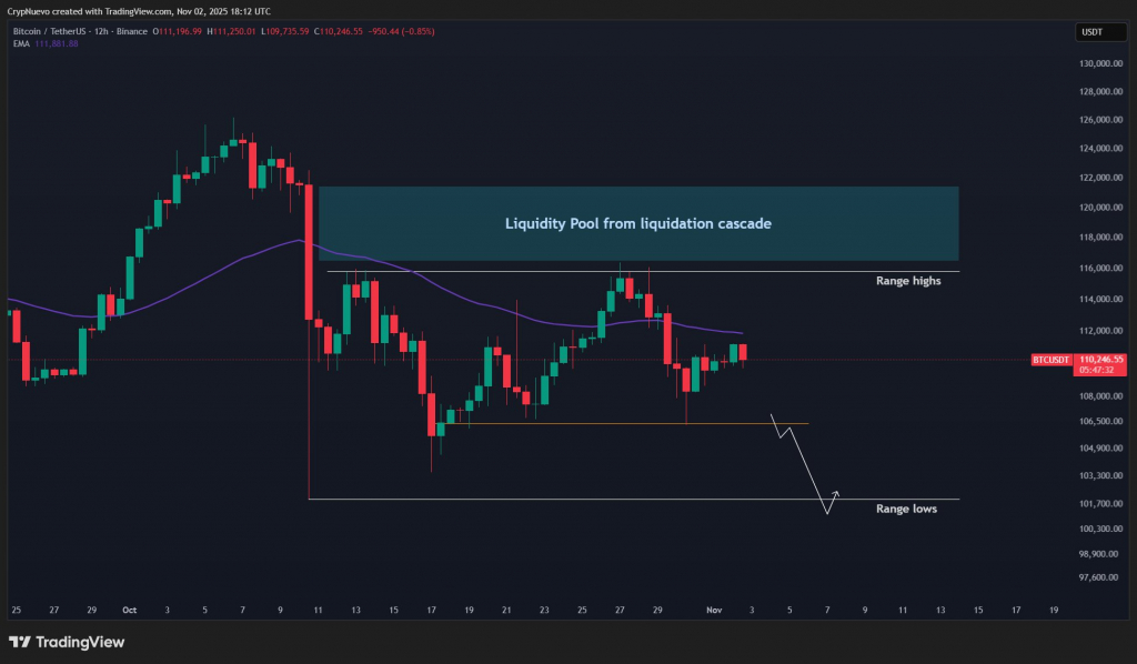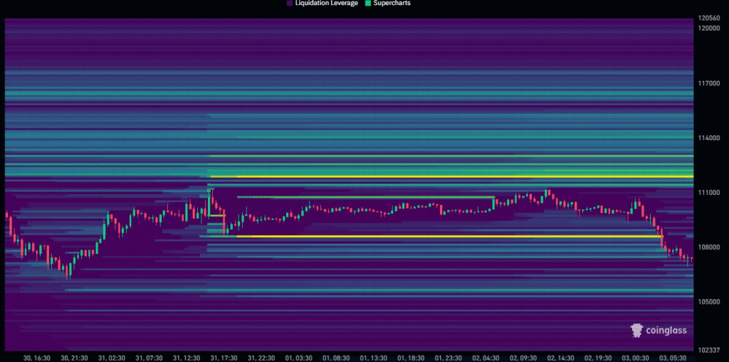 Другие аналитики сосредоточились на ликвидности биржевых стаканов. Daan Crypto Trades выделил два крупных уровня ликвидности: «Цена пробила нижнюю границу на $108 000. Приличный кластер все еще остается около $112 000. При более широком рассмотрении стоит обратить внимание на уровни $105 000-106 000 и $117 000».