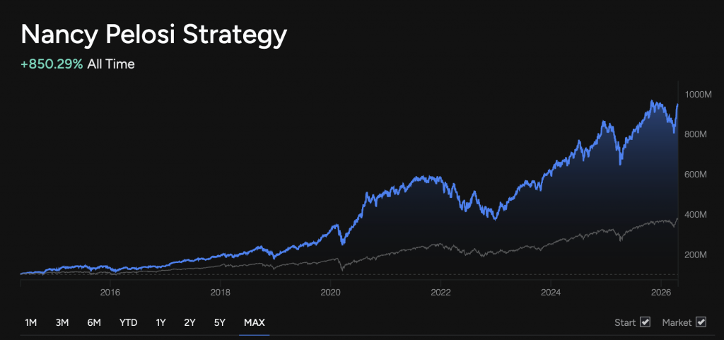 По данным Quiver Quantitative, стратегия зеркалирования портфеля Пелоси с мая 2014 года принесла +850 % при доле выигрышных сделок 73 % из 731 сделки. Агрегатор Insider Finance считает иначе, но не менее впечатляюще: +179,7 % за 211 сделок, обгон S&P 500 на 151,8 процентных пункта, доля выигрышных сделок — 84 %. Состояние Пелоси на апрель 2026 года оценивается в $625,2 млн. Для сравнения: XTX Markets Александра Герко (Alex Gerko) — одна из самых прибыльных трейдинговых компаний в мире — зарабатывает $8–9 млн на сотрудника в год, держит в штате 250 человек, строит дата-центры в Финляндии за $1 млрд и торгует на $250 млрд ежедневно. Пелоси обходится без всего этого.