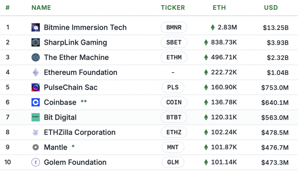 Приток капитала в ETF в последние месяцы совпал с действиями публичных компаний. BitMine и SharpLink добавили ETH на свои балансы — тренд, который напоминает движение по созданию биткоин-резервов, возглавляемое Strategy. Эта стратегия позволяет компаниям диверсифицировать активы и участвовать в росте второй по капитализации криптовалюты.