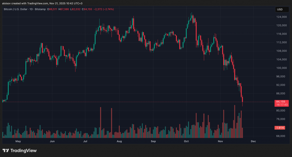 Биткоин протестировал уровень $82 000 впервые за 234 дней, зафиксировав падение на 35% от исторического максимума, установленного 6 октября. Падение первой криптовалюты за сутки 20 ноября составило 5,5%, в то время как Ethereum опустился ниже $2 700, потеряв 45% от своего пика 24 августа.