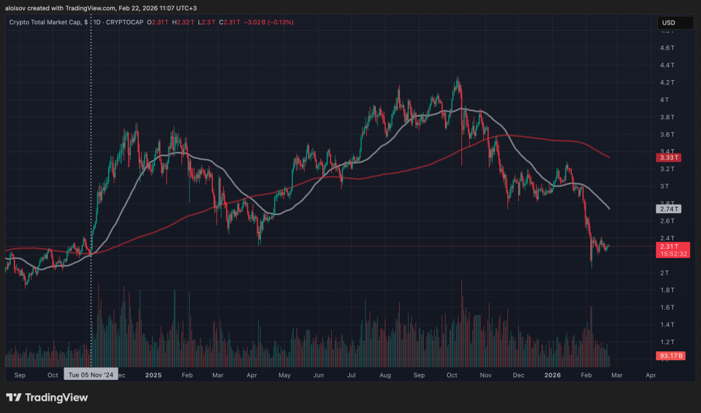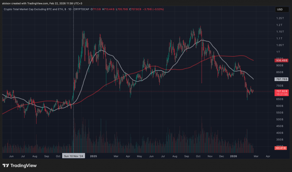 После декабрьского максимума рынок скорректировался до диапазона $900 млрд, затем ненадолго восстановился до $1,13 трлн 18 января 2025 года — за два дня до инаугурации Трампа. Большую часть 2025 года котировки торговались в боковике, пока в октябре Total3 не достиг нового пика — около $1,19 трлн. Именно тогда обвал рынка сломил восходящий тренд, и с тех пор убедительного восстановления так и не последовало.