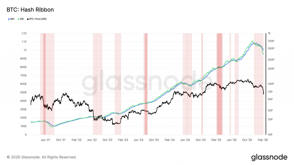 Индикатор Hash Ribbons тоже подал тревожный сигнал: 30-дневная средняя хешрейта опустилась ниже 60-дневной — негативная инверсия, которая исторически указывает на серьезный стресс в доходах майнеров и повышает риск капитуляции.