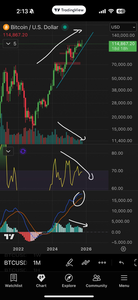 По его мнению, на месячном графике BTC/USD наблюдаются снижающиеся объемы, и формируется медвежья дивергенция по RSI.