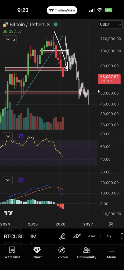 Трейдер Roman указал на стандартные параметры падения в прошлых медвежьих циклах. По данным Glassnode, в предыдущих циклах биткоин терял порядка 80% от пика. На 15-месячном минимуме, зафиксированном в начале февраля, максимальная коррекция BTC/USD составила около 53% от исторического максимума октября 2025 года. Roman предостерег от поспешных выводов: каждый медвежий цикл сопровождался снижением почти на 80%, а на месячном и недельном графиках признаков разворота пока не наблюдается.