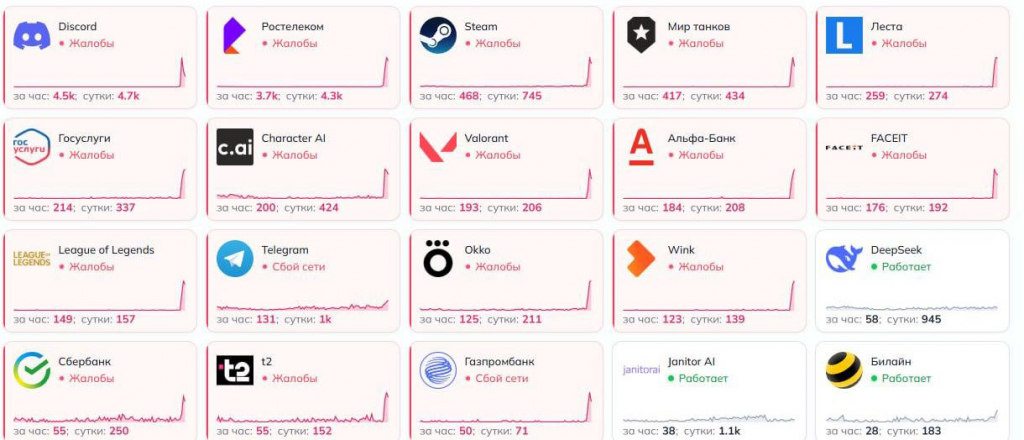 Жалобы поступали из разных регионов. Наибольшее количество обращений зафиксировали в Самарской области, заметная доля пришлась также на Москву. По данным мониторинговых сервисов, пик проблем пришелся на вечер 6 апреля, когда тысячи пользователей одновременно сообщали о недоступности сервисов.