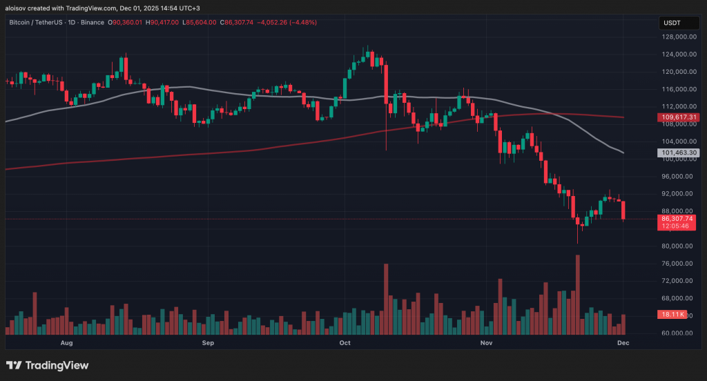 Биткоин обвалился к отметке $85 000 в начале декабря. Общие потери по итогам ноября составляют 17,7%.