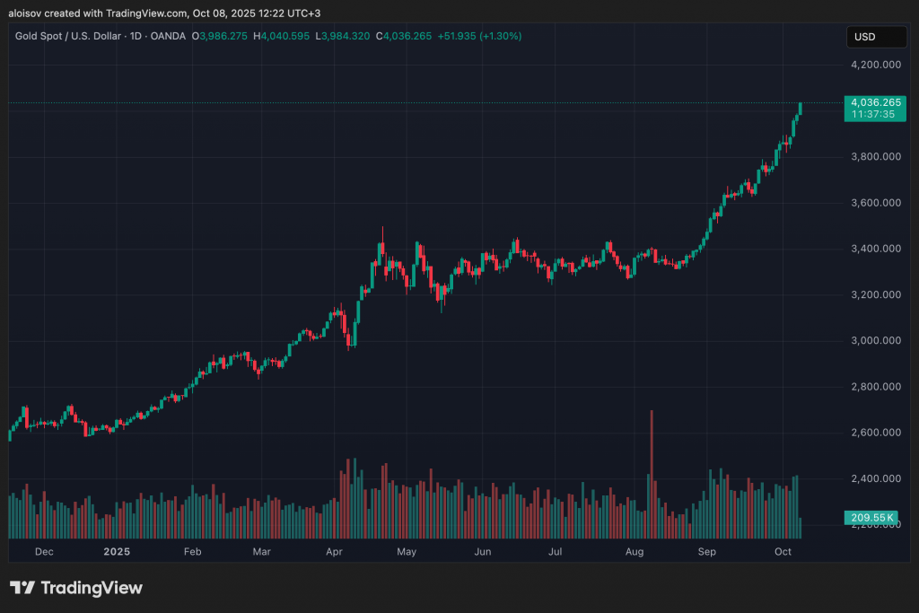 Одновременно с этим спотовая цена золота преодолела отметку $4 000 за унцию. Рост драгоценного металла поддерживают опасения по поводу финансового тупика в правительстве и возобновившиеся дискуссии о независимости ФРС. Капитал перетекает из перегретых акций компаний сферы искусственного интеллекта в защитные активы, что усиливается продолжающимися покупками золота центральными банками. QCP Capital отмечает, что более мягкая позиция ФРС с низкими ставками и большей терпимостью к инфляции создаст благоприятные условия как для золота, так и для биткоина.