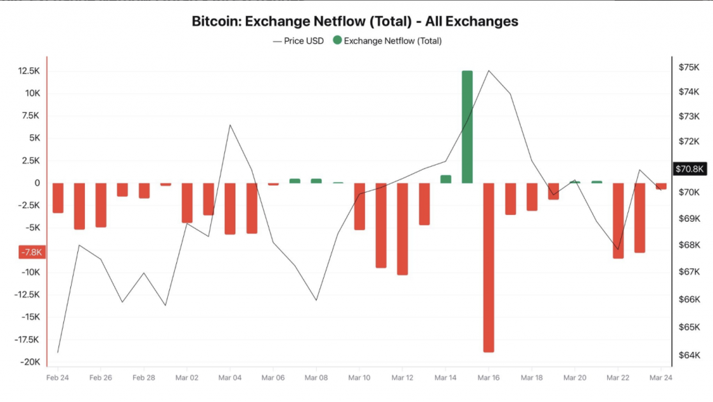 По данным CryptoQuant, март прошёл под знаком отрицательного потока биткоина на биржи: монеты из них уходили, а не поступали. Единственным исключением стал кратковременный всплеск притока незадолго до того, как 17 марта актив достиг шестинедельного максимума в $76 000. Аналитик CryptoQuant под ником Darkfost расценил эту картину однозначно: «Устойчивый отток указывает на реальное накопление со стороны инвесторов, которые продолжают покупать биткоин и выводить его с бирж».