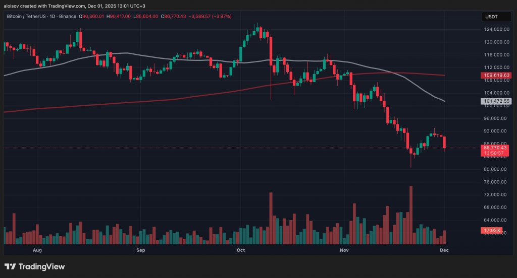 Трейдинговая фирма QCP Capital выпустила отчет о текущих событиях на рынке биткоина, обращая внимание на резкое падение первой криптовалюты в начале декабря. После спокойных торгов на День благодарения биткоин стартовал декабрь с негативной динамики, упав с $91 000 до $86 000 за несколько часов в азиатскую сессию и стерев большую часть прибыли предыдущей недели.