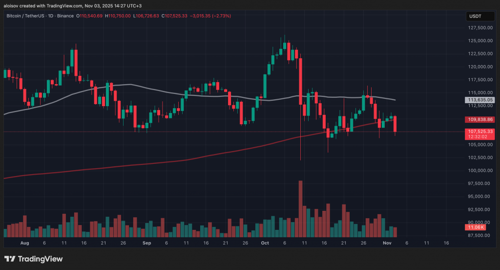Биткоин начал ноябрь с падения — цена снизилась со $110 000 до $107 000 во время азиатской торговой сессии. Данные блокчейна показывают, что долгосрочные держатели переводили крупные суммы биткоина на биржу Kraken. Эта активность продолжает тренд оттока средств, который наблюдался в октябре и объясняет первый отрицательный октябрь для биткоина с 2018 года.