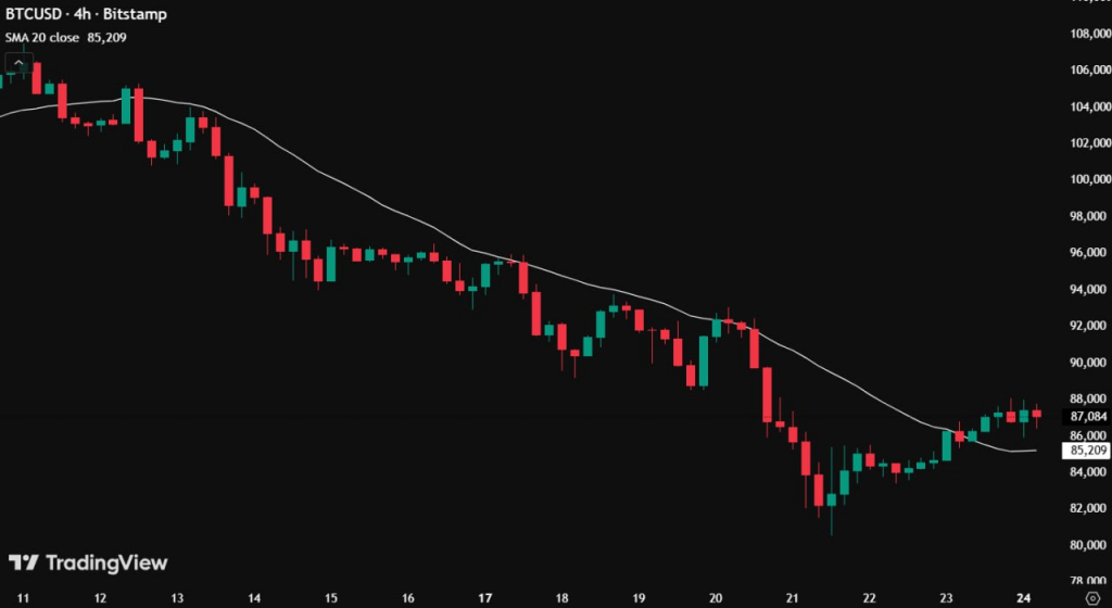Трейдер BitBull отметил позитивный сигнал: «Биткоин впервые за две недели вернулся выше 20-периодной простой скользящей средней на четырехчасовом графике». По его мнению, на коротких таймфреймах BTC выглядит неплохо. Завершение недели выше $92 000 может запустить ралли к $105 000-110 000.