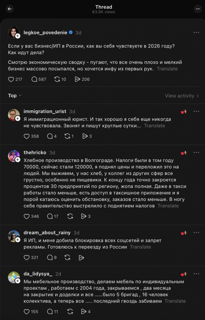 В социальной сети Threads* сотни предпринимателей со всей страны описывают одну и ту же картину. Хлебопек из Волгограда: налоги почти удвоились, поднял цены, переложил на покупателей. Мебельное производство с 2004 года, 16 человек в коллективе — закрывается. Владелец общепита: выручка упала с 300 000 рублей в январе до 20 000 в феврале и марте — такого не было даже в кризисный 2018 год. Производитель компьютеров под заказ с девятилетней историей раздал сотрудников «в добрые руки» и ликвидирует ИП. Бухгалтер, обслуживающий малый бизнес, потерял половину дохода — просто потому что клиенты сворачиваются.