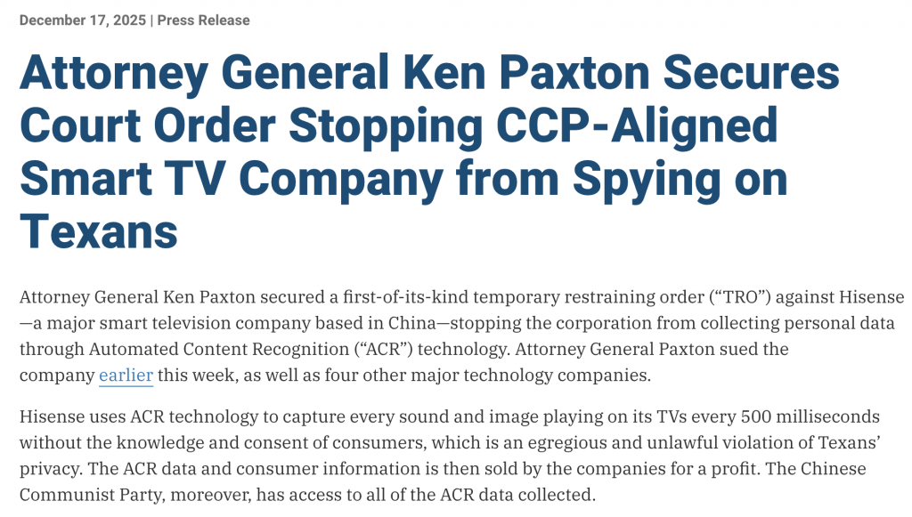 17 декабря Пакстон добился беспрецедентного временного запретительного приказа против Hisense. Это первый в истории США судебный запрет, блокирующий сбор данных производителем смарт-телевизоров. Компании теперь запрещено собирать, использовать, продавать и передавать данные ACR жителей Техаса до завершения судебного разбирательства.