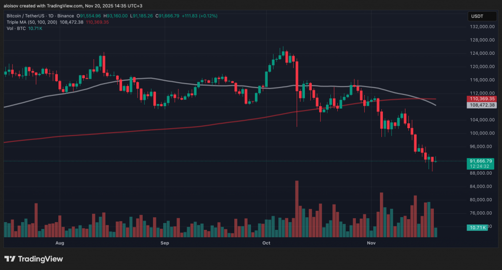 Пятидневная серия чистого оттока с 12 по 18 ноября привела к выводу более $2,26 млрд из биткоин-ETF. Этот отток совпал с общим спадом на криптовалютном рынке, когда биткоин опустился ниже $90 000 после достижения исторического максимума свыше $126 000 несколькими неделями ранее.