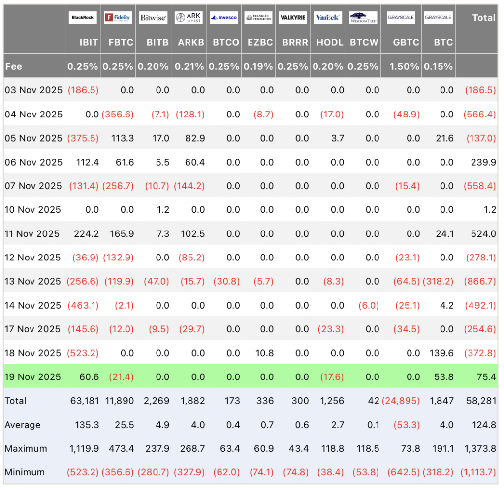 Американские биткоин-фонды привлекли $75,47 млн чистого притока 19 ноября. Основную долю составили $60,61 млн, поступившие в IBIT от BlackRock, и $53,84 млн, направленные в Grayscale Mini Bitcoin Trust.