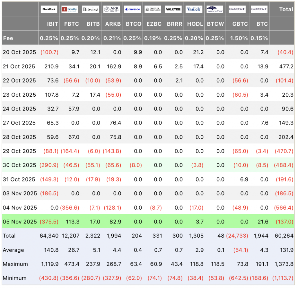 Волна распродаж началась 29 октября и уже стерла с рынка более $2,04 млрд. Самым тяжелым днем стало 4 ноября, когда инвесторы вывели $566 млн, после предыдущих сессий с оттоками в $470 млн, $488 млн и $191 млн.