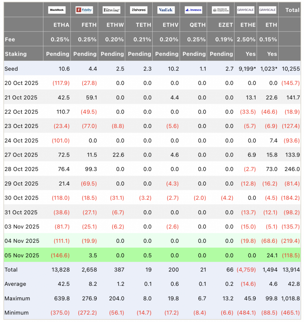 Спотовые Ethereum-ETF также продолжили испытывать давление продавцов 5 ноября, зафиксировав чистый отток в $118,5 млн. Среди эмитентов лидером по оттокам стал ETHA от BlackRock с $146,6 млн, в то время как ETHW от Bitwise и ETHV от VanEck остались стабильными.