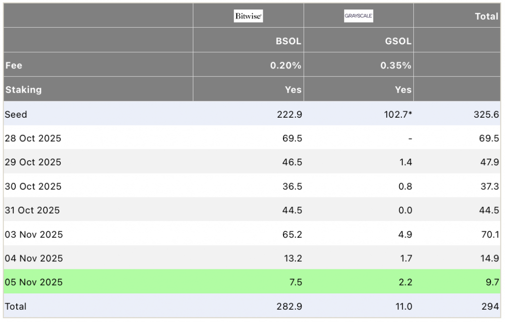 В отличие от биткоина и Ethereum, ETF на Solana продолжают привлекать средства, получив 5 ноября еще $9,7 млн. Это седьмой день подряд положительных потоков. Последний приток доводит общие чистые поступления с момента запуска до $294 млн.